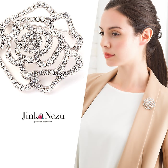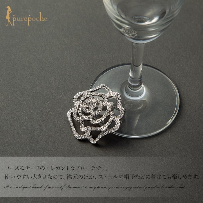 ローズモチーフのエレガントなブローチです。使いやすい大きさなので、襟元のほか、ストールや帽子などに着けても楽しめます。