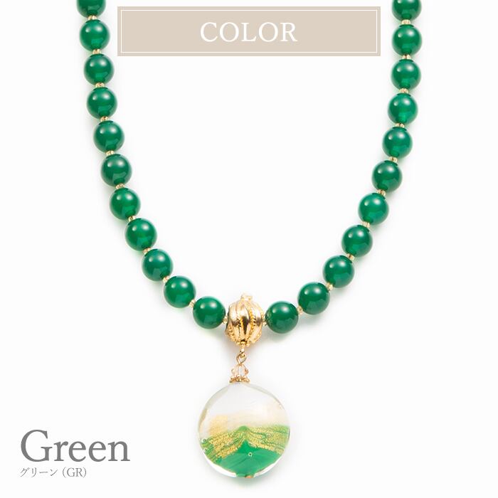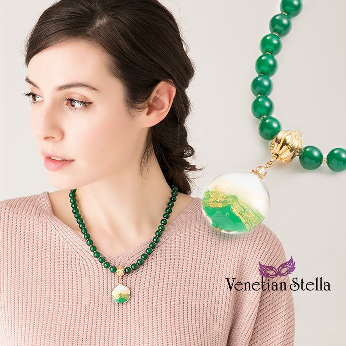 グリーン(verde)のヴェネチアンガラスをトップに、グリーンの天然石をつかったランクアップしたネックレスです。大人の雰囲気の逸品です。