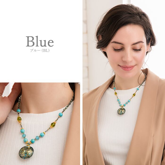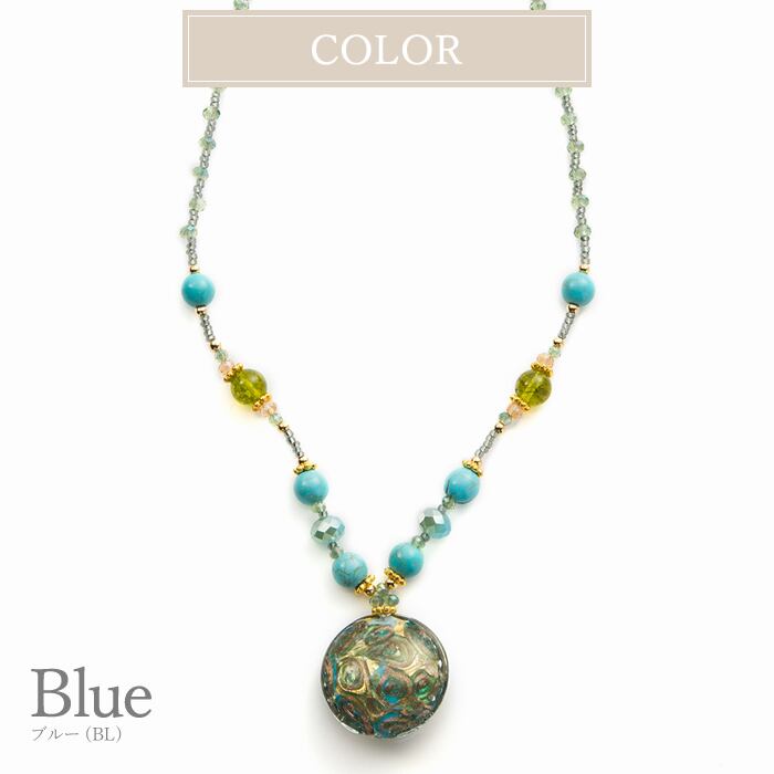 ブルーカラーのガラスに金箔を巻き、アベンチュリーナと色ガラスで渦巻き模様を付けたヴェネチアンガラスをトップに使ったランクアップしたネックレスです。オンオフに使える大人の雰囲気の逸品です。