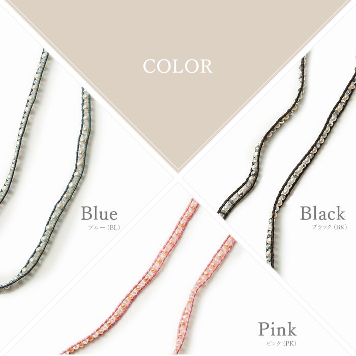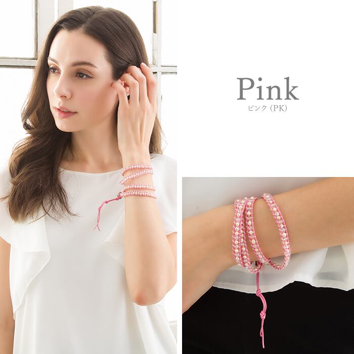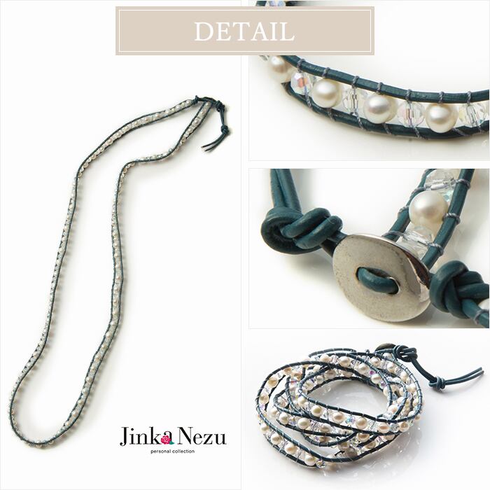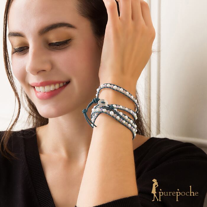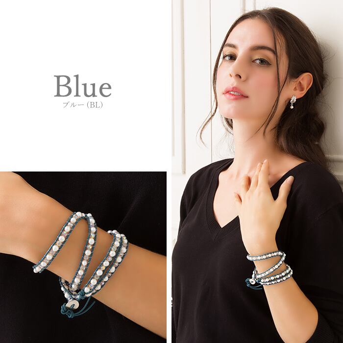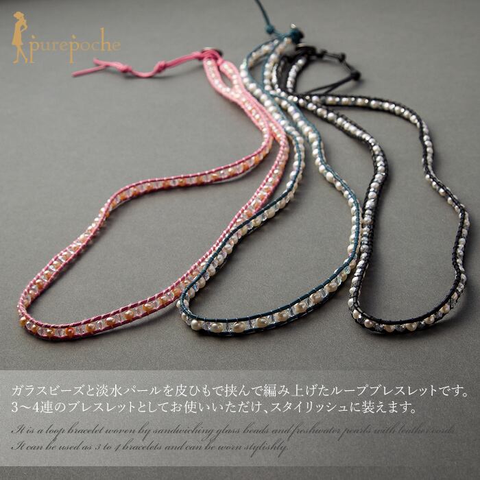 ガラスビーズと淡水パールを皮ひもで挟んで編み上げたループブレスレットです。3〜4連のブレスレットとしてお使いいただけ、スタイリッシュに装えます。