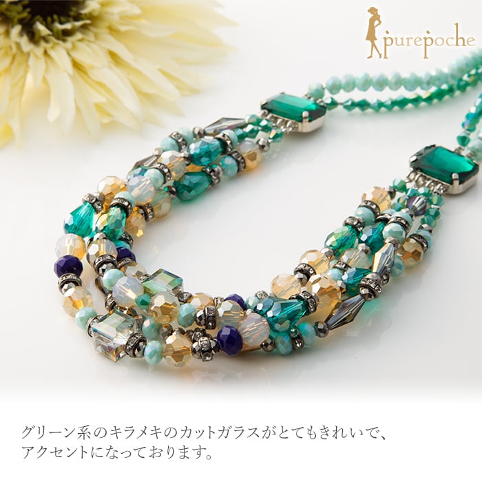 宮殿をエメラルドカラー系で飾り付けた装飾品をイメージしたキラキラのネックレス。グリーン系のキラメキのカットガラスがとてもきれいで、アクセントになっております。