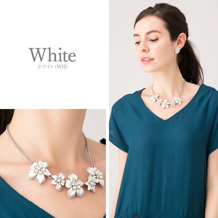 雪のお花をイメージしたデザインのネックレス。大小のお花をキラキラカットガラスで飾り付けたピュアでキラキラなネックレスです。