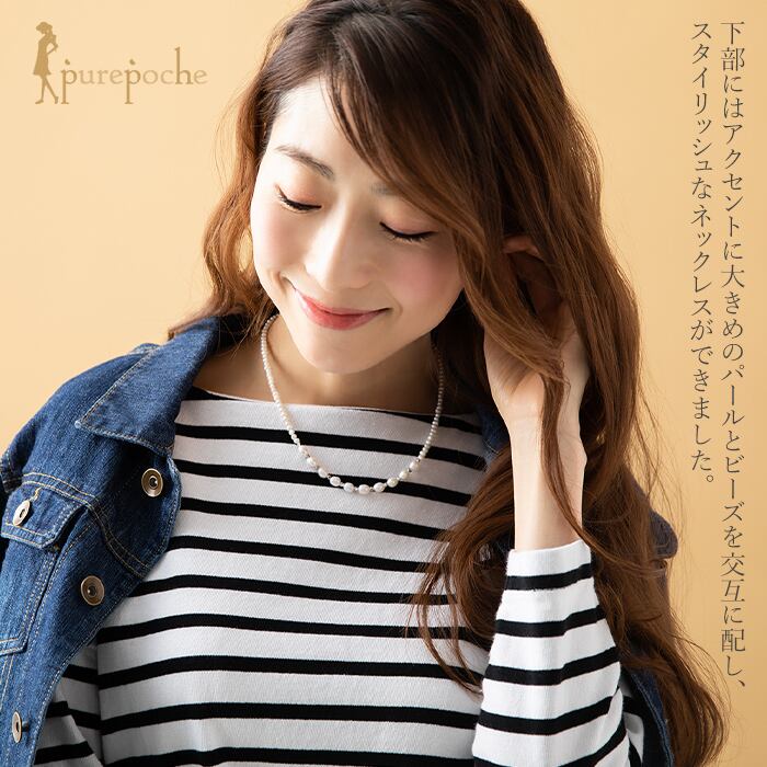 淡水パールのデザインショートネックレスです。下部にはアクセントに大きめのパールとビーズを交互に配し、スタイリッシュなネックレスができました。