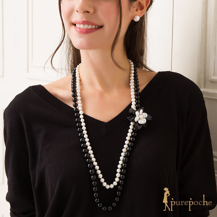 ネックレス ロング 淡水パール オニキス ガラス 花