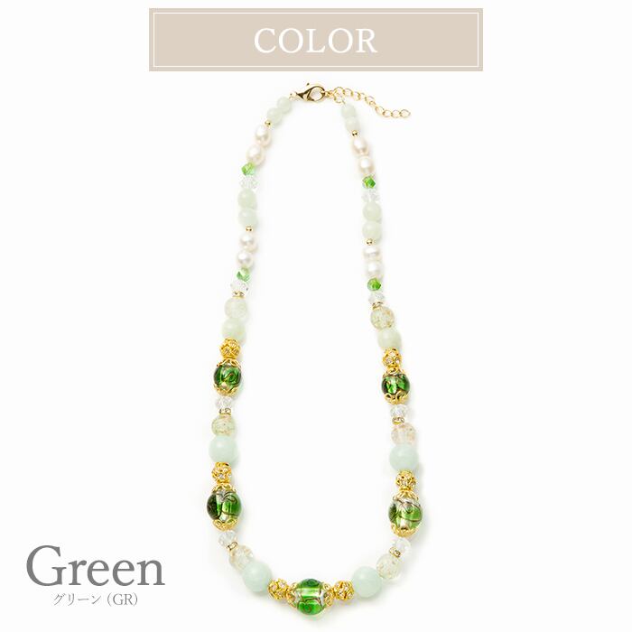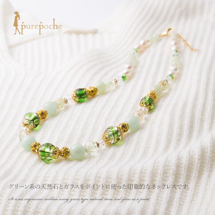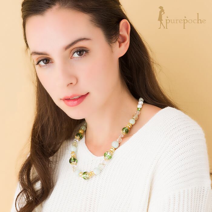 グリーン系の天然石とガラスをポイントに使った印象的なネックレスです。さわやかなアップルグリーンカラーで、ランクアップな装いをお楽しみください。