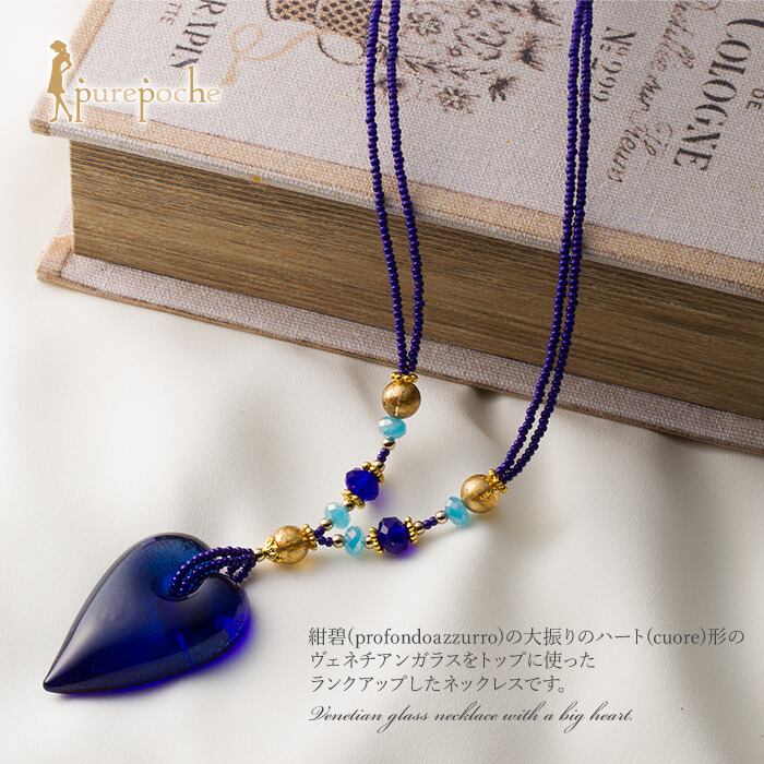 紺碧(profondoazzurro)の大振りのハート(cuore)形のヴェネチアンガラスをトップに使ったランクアップしたネックレスです。オンオフに使える大人の雰囲気の逸品です。