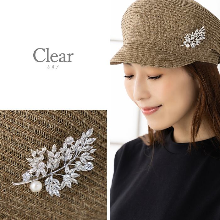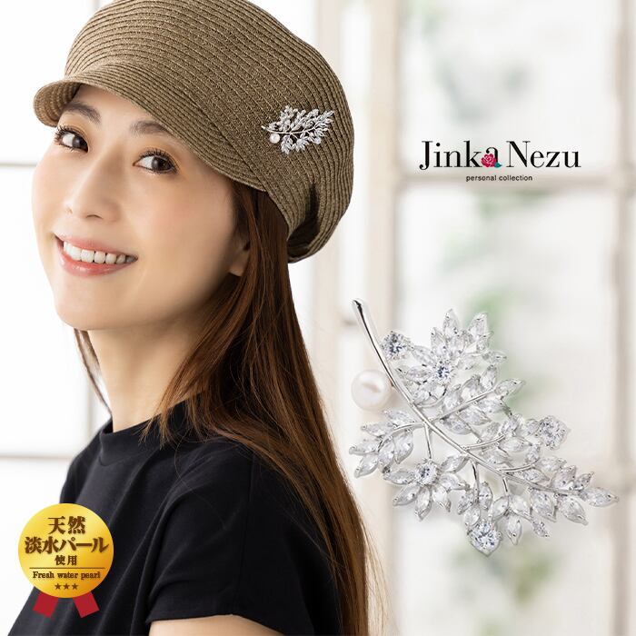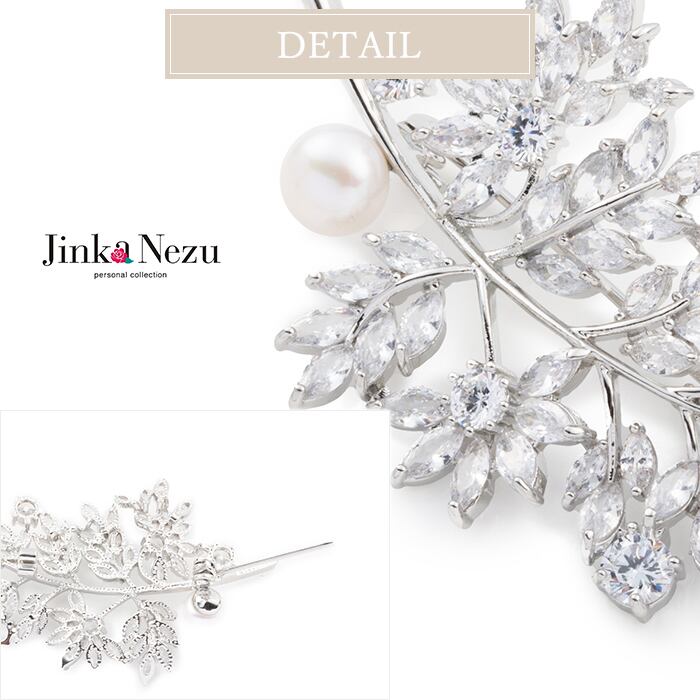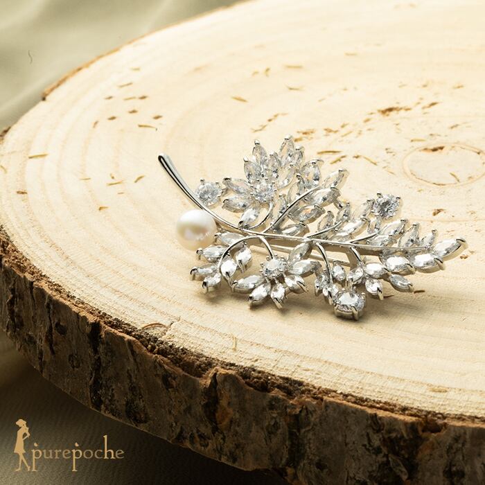リーフモチーフのブローチ。葉の部分にはキュービックジルコニアをあしらい、アクセントに淡水パールをレイアウトしています。