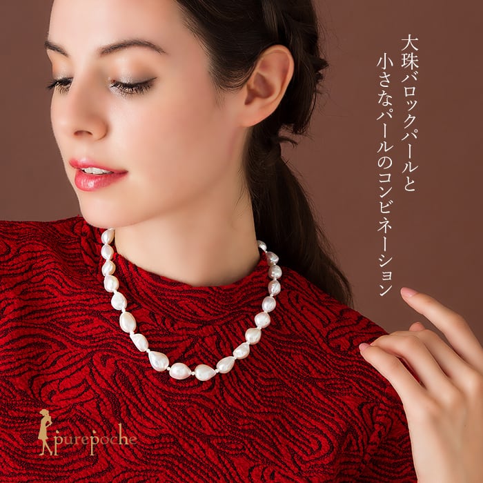 淡水バロックパールを使った、グラデーションのネックレスです。大粒のバロック珠の間に小さいパールを入れています。