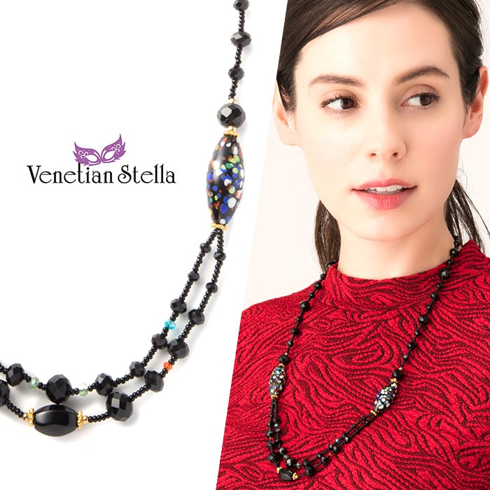 ブラックベースのビーズにいろいろな色がふりかけられた(spolvero)ヴェネチアンガラスを2個メインビーズとして使ったランクアップしたネックレスです。