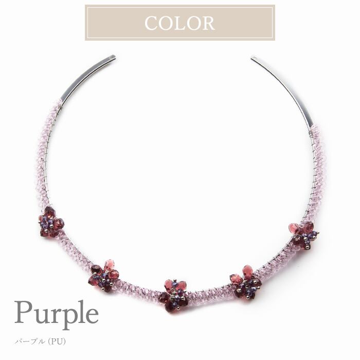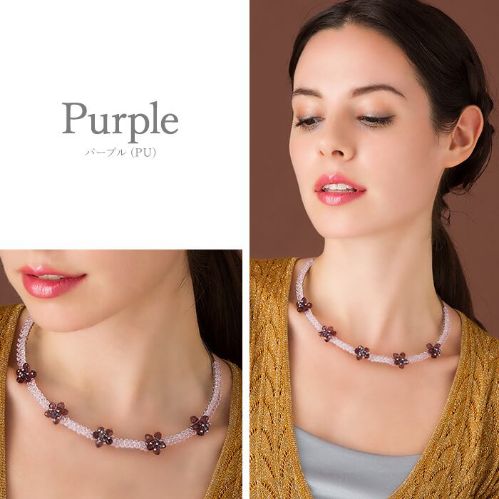 首元に可憐なプチフラワーが5つ咲いたようなパープル系チョーカーネックレス。落ち着きのある色合いで大人可愛い表情をお楽しみいただけます。