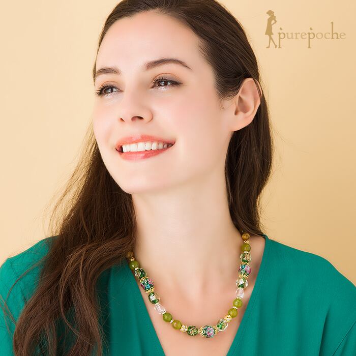 深みのあるグリーンのビーズ、天然石を豊富に使用しました。さわやかなグリーンカラーの、オーガニックな雰囲気のネックレスです。深みのあるグリーン系のビーズに天然素材を組み合わせたシックで華やかなネックレスです。