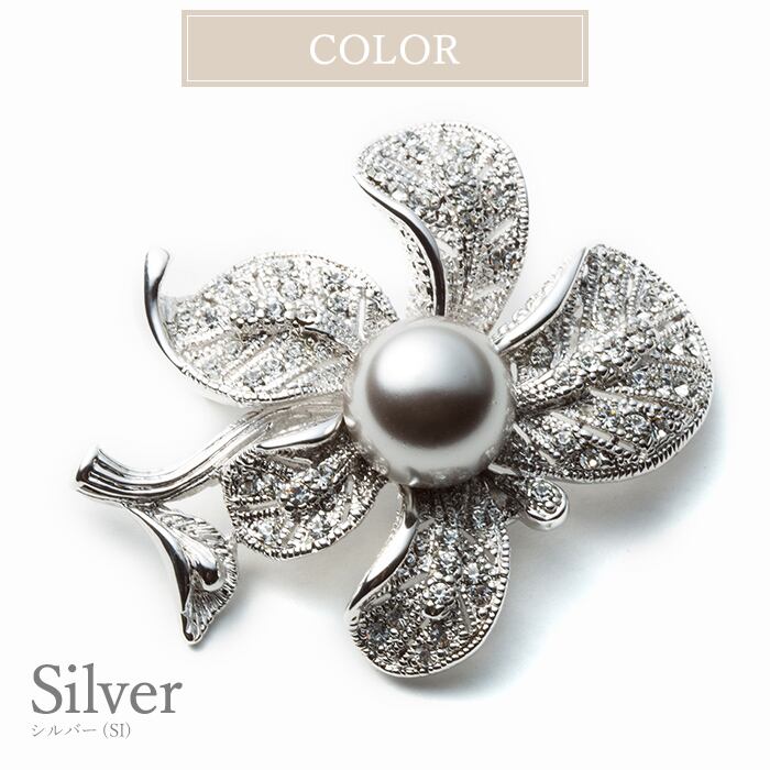 オーキッドの花びらに、霧が雫となって光っている様子をイメージしデザインしたブローチです。シルバーグレーカラーの色味のプラスチックパールとアクセントのキラキラのきらめきにより、エレガントな装いを演出できます。