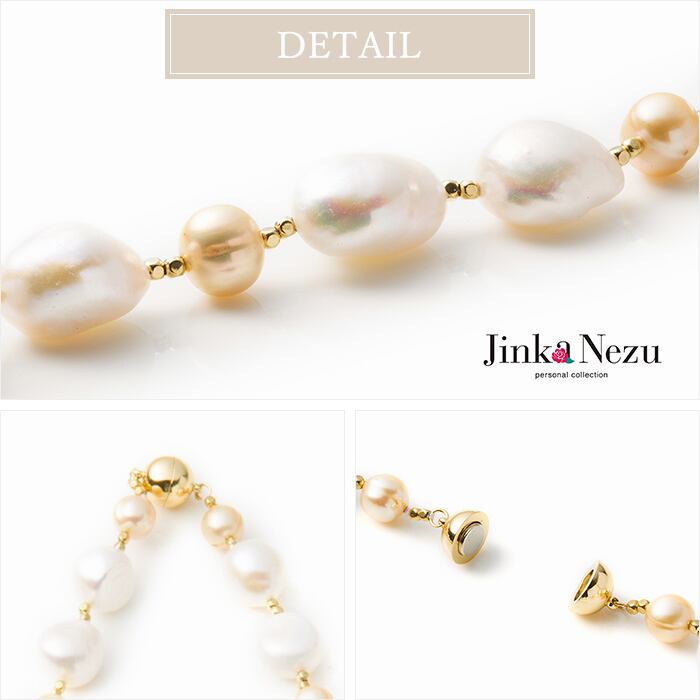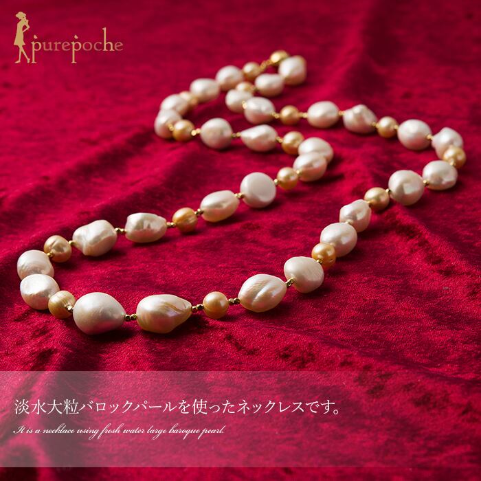 淡水大粒バロックパールを使ったネックレスです。大粒のバロック珠の間に小さめのシャンパンカラーの珠を入れてリズム感を加えています。華麗に胸元を彩ります。