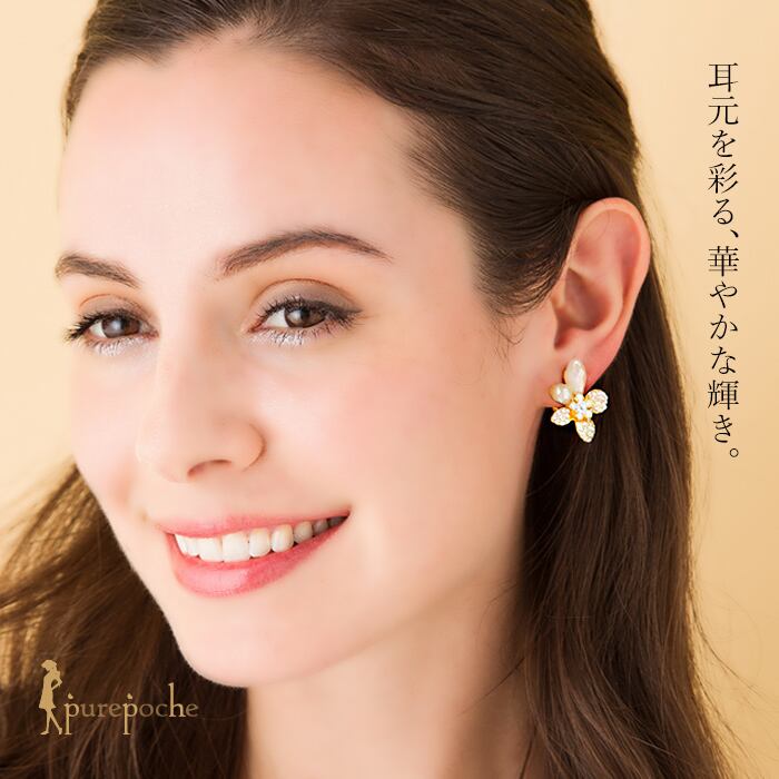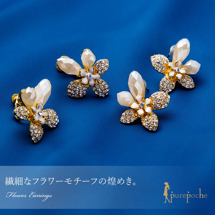 さまざま着こなしにコーディネートできる、繊細なフラワーモチーフのクリスタルガラスのフラワーモチーフイヤリングです。