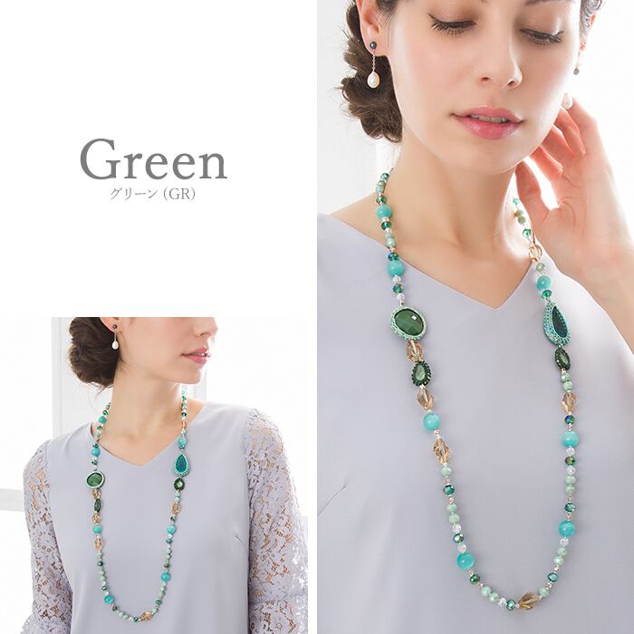 グリーンからブルー系のトーンのピーコックカラーの素材で、落ち着いた安らぎ感のあるネックレスです。グリーンカラーなので、ファッションに合わせやすく、年齢問わずお使いいただけます。きらきらと輝くシックなネックレスです。