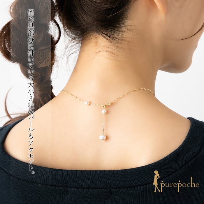 留め具部分に付いている大小3粒のパールもアクセント、おしゃれなネックレスです。