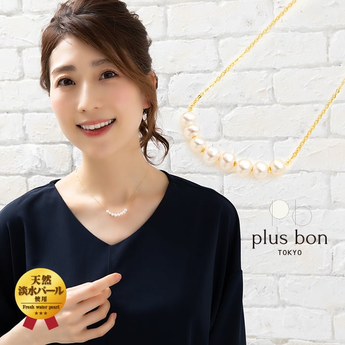 首元と留め具部分に淡水パールをあしらったデザインネックレスです。チェーンのゴールドと首元8粒のパールがしっぽりと輝き、華奢で上品な雰囲気を演出します。