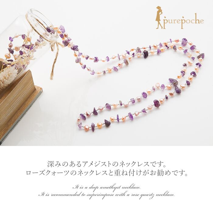 深みのあるアメジストのネックレスです。ローズクォーツのネックレスと重ね付けがお勧めです。