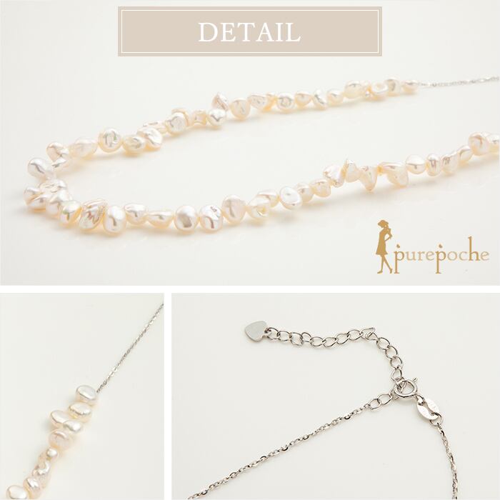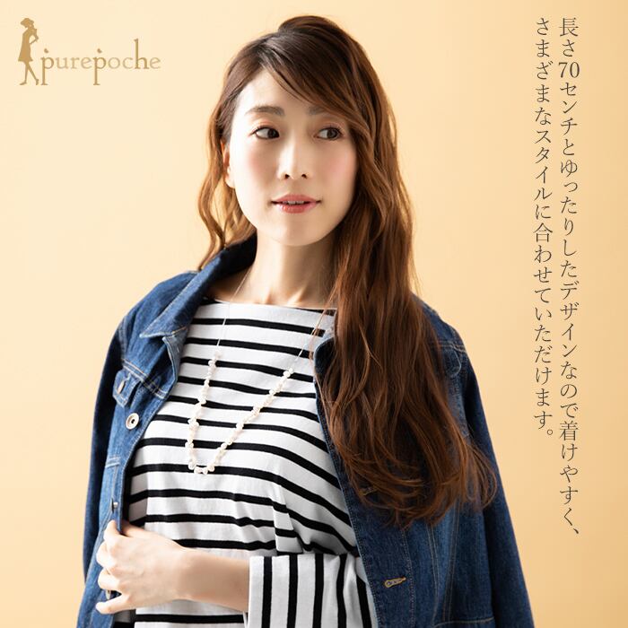 胸元にケシパールをあしらったネックレスです。長さ70cmとゆったりしたデザインなので着けやすく、さまざまなスタイルに合わせていただけます。