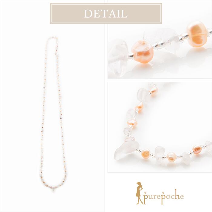 淡いローズクォーツのさざれ石でできたネックレスです。肌なじみの良いカラーとなっています。