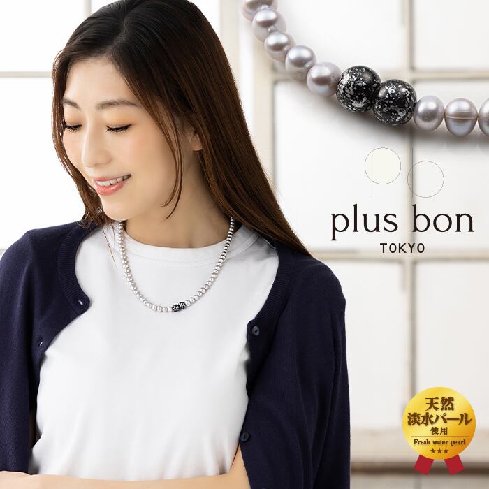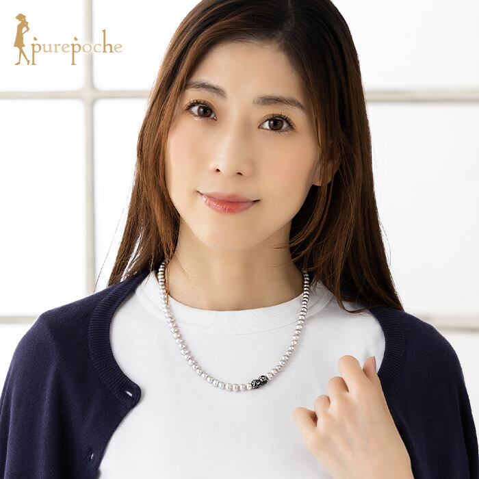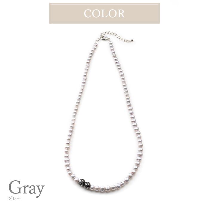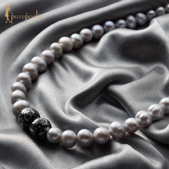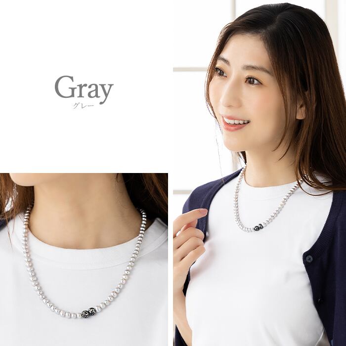 グレーの淡水パールにヴェネチアンガラスをふた粒デザインに落とし込んだネックレス。パールネックレスだけど、スタイリッシュな印象です。