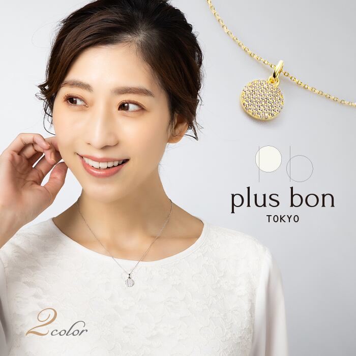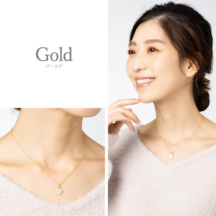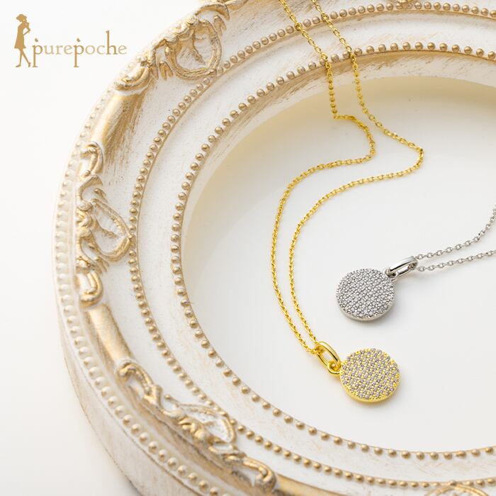 シンプルなサークルモチーフのネックレス。サークルには小さなキュービックジルコニアを敷き詰めていて、揺れるときらきらします。