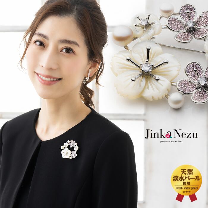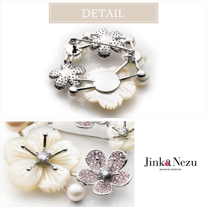 シェルとキュービックジルコニアで飾られたさくらの花を配置したブローチです。