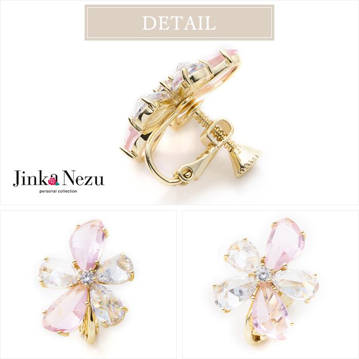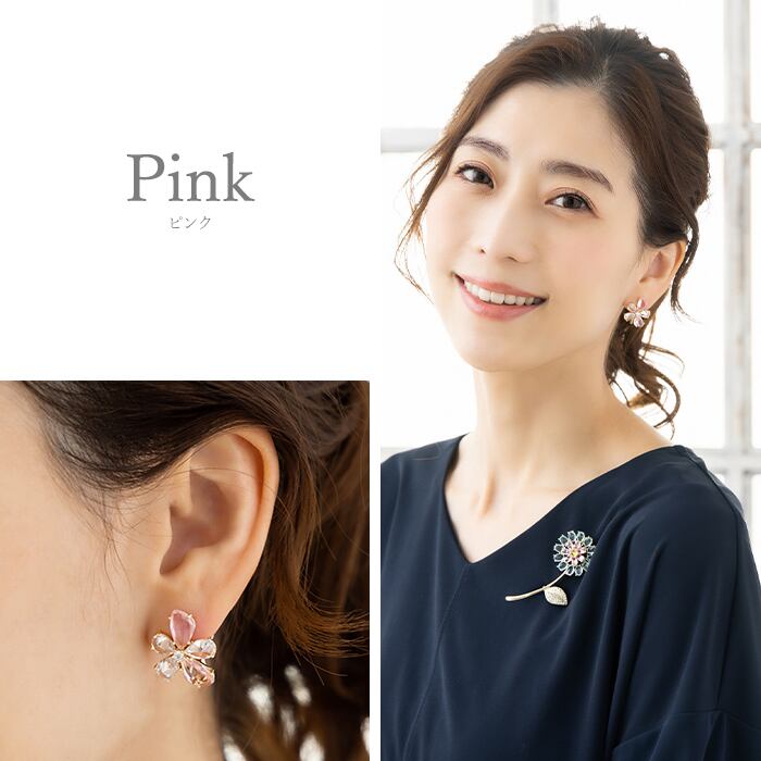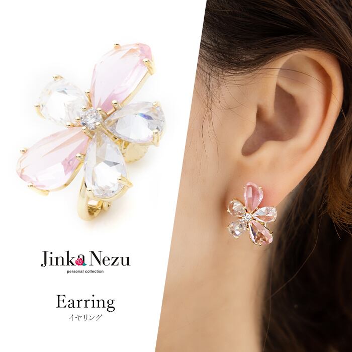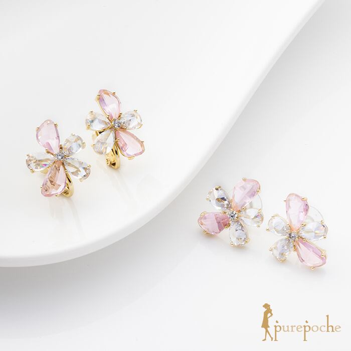 花びらはクリアとピンクの組合せで優しいイメージに仕上がりました。透明感があり涼やかなお花が耳元で花咲きます。