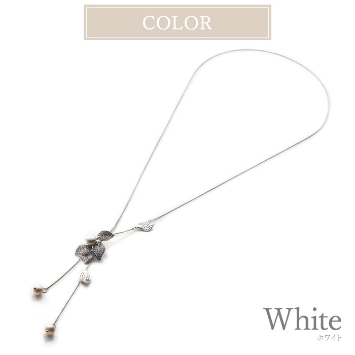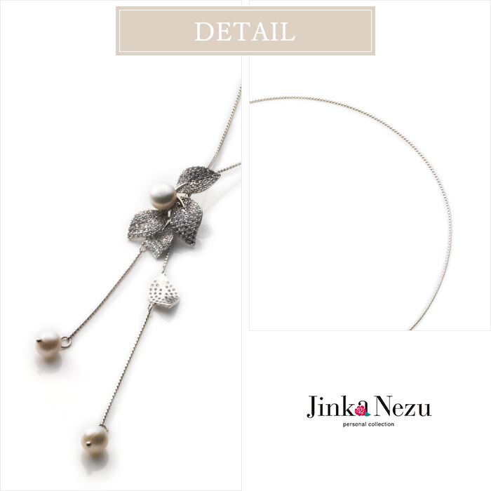 淡水パールとリーフデザインをスライダーにしたネックレスです。リーフには一面にキュービックジルコニアがセットされています。