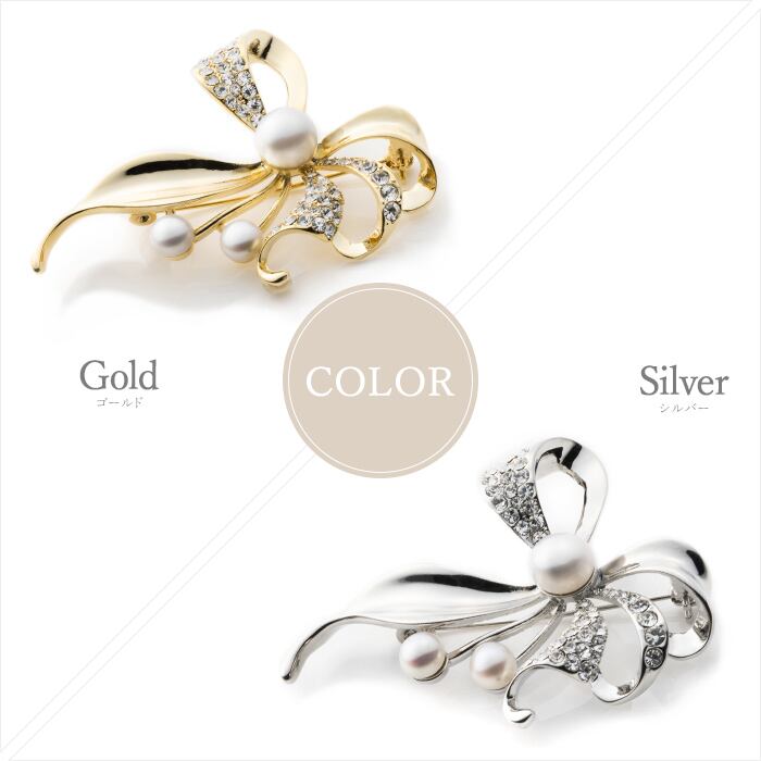 エレガントなリボンモチーフに淡水パールとクリスタルガラスをセットしたゴージャスなブローチです。