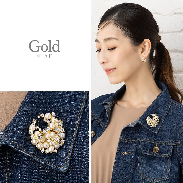 樹脂パールとガラスをふんだんに使用した三日月モチーフの美しいブローチ。高低差をつけて立体的に仕上げた三日月型のフォルムに、キラキラと瞬く繊細な輝きを散りばめました。