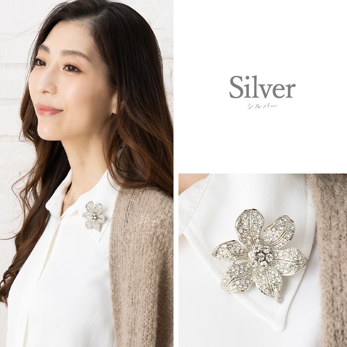 マグネットタイプなのでデリケートなお洋服などにも針穴を開けずに装着でき、着け外しも簡単。襟元のほか、ストールや帽子のアクセントとしてもお楽しみいただけます。