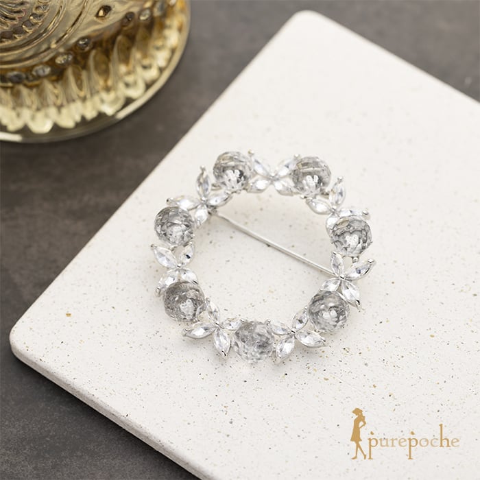 多面カットの水晶とキュービックジルコニアが瑞々しく輝くブローチです。